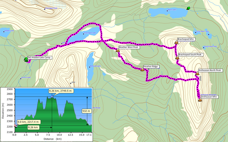 Kane’s ascent route to Anthozoan seems to aim middle of ridge but we decided to go up to the north peak and then take ridge to the true summit. Our route worked pretty good in my opinion. Unlike Brachiopod’s descent route, rocks on this ascent route was solid rubbles which helped to go up. Once on the ridge it was easy ridge walk to the true summit. From summit we could have started descent but going to Heather Ridge on mind, it was better to trackback the ridge closer to the north summit. This way we could save some elevation when get down to the valley.