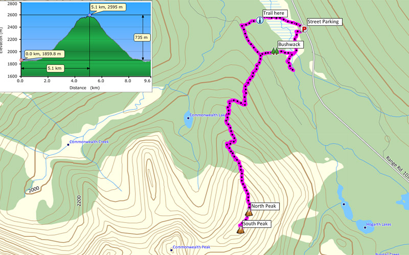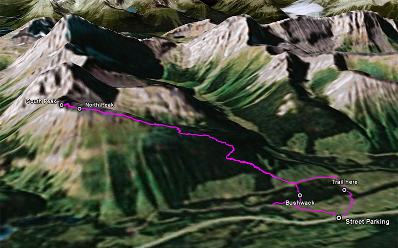 Pink line is the actual track I took which was recorded by my GPS. There isn't much to add. Most of the way is straight forward. There is a false summit block right before the south summit (true summit). You can go west to get around the block.